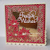 8x8" cardbase. I cut a piece of white card to fit my card front, i made a circle mask using my large circle dies from a piece of spare cardstock, using re-positional glue i attached it to my white card panel. I then painted inside the circle with clean water and sprinkled on brushos in shades of green and gold & red pixie powders. Let dry completely.